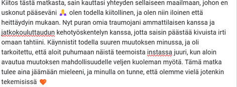 Autan ja tuen ihmisiä siinä, missä he kulloinkin ovat. Autan heitä näkemään sen, mitä he eivät vielä itse näe. Koen edelleenkin olevani vahvasti matkalla, mutta näen kaiken eri silmin. Haasteet, jotka eteeni tulee, eivät enää estä minua etenemästä, vaikka ne todella joskus pelottavatkin.